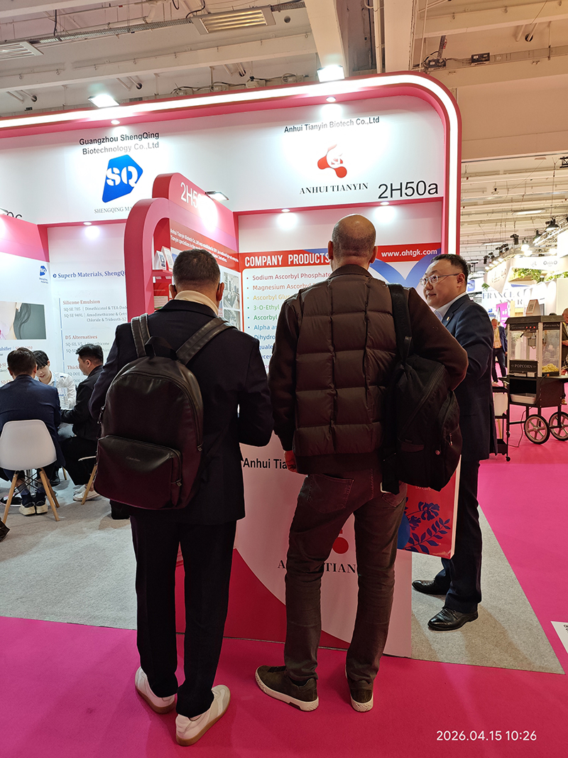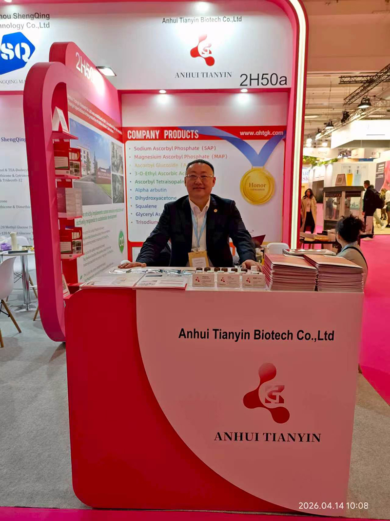 At this exhibition, Anhui Tianyin not only showcased its core products such as Sodium Ascorbate Phosphate (SAP), Magnesium Ascorbate Phosphate (MAP), Ascorbic Acid Glucoside (AA2G), and Ethyl Ascorbate (EAA), but also grandly launched new products including Tetraisopalmitoyl Ascorbate (VCIP), Ascorbyl Palmitate Phosphate Trisodium Salt (APPS), nano-sized water-soluble squalene, and Ascorbyl Glycerate.