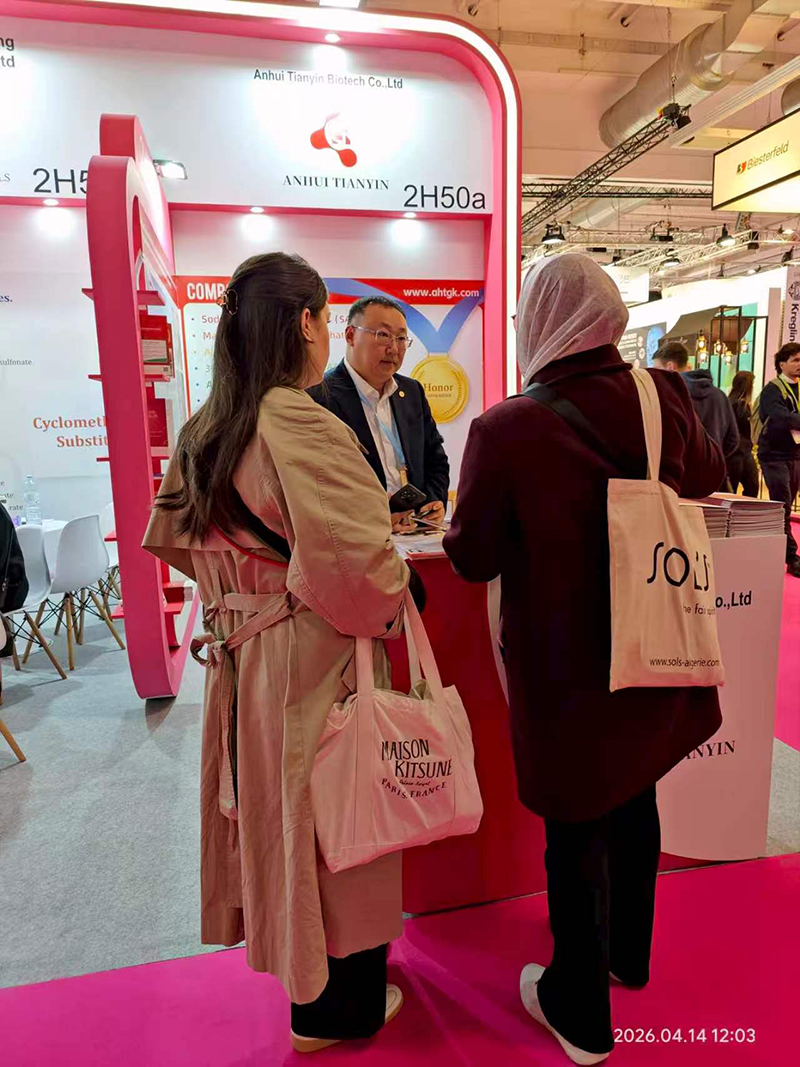 As the first stop of overseas exhibitions in 2026, Anhui Tianyin Biotechnology Co., Ltd. made its appearance at this "wind vane" exhibition of the beauty industry as scheduled, bringing its core stable vitamin C derivatives to join over 1,000 top exhibitors from around the world and more than 14,000 professional visitors. It engaged in in-depth connections with the international market, shared products with global customers, and exchanged experiences.